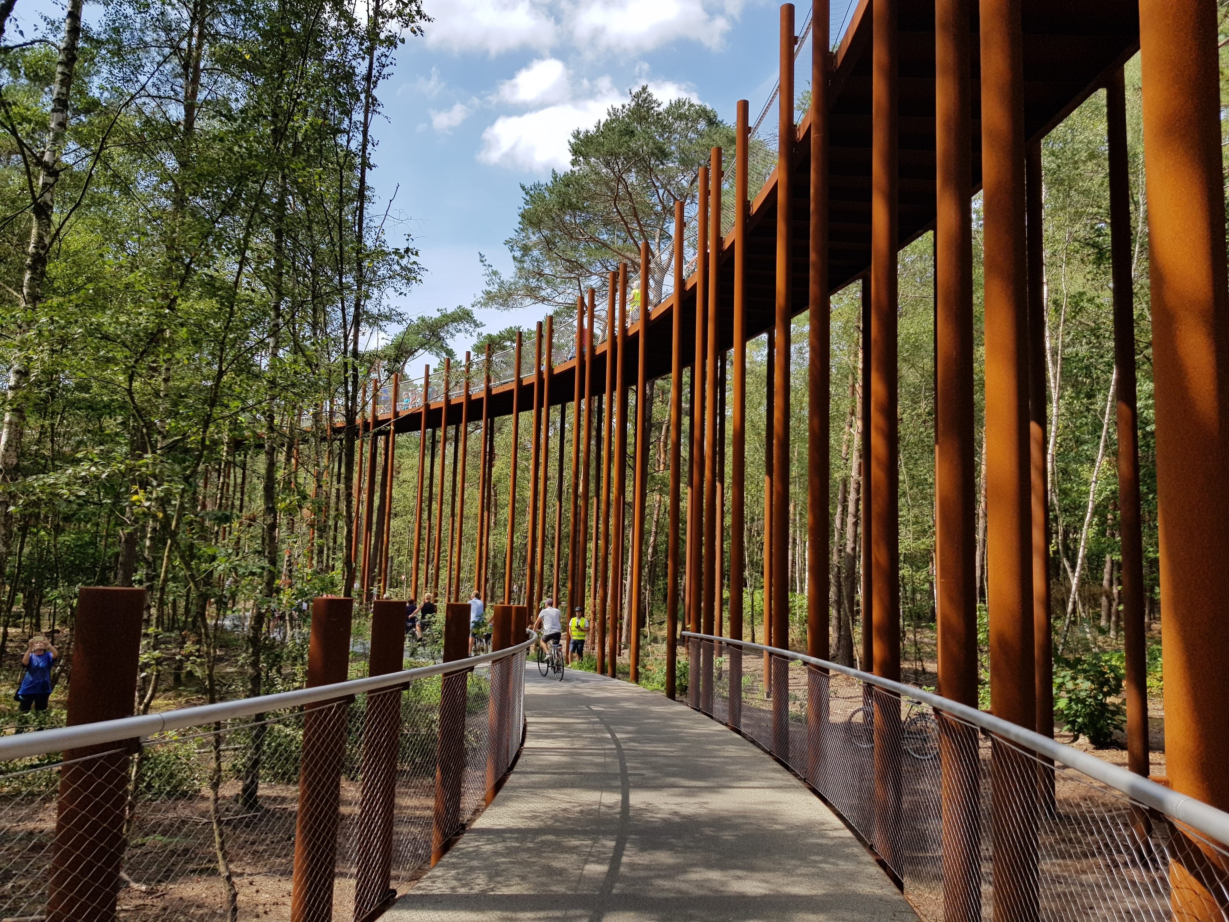 Fiets gedurende 700 meter tussen de boomkruinen in Hechtel-Eksel. De fietsbrug bestaat uit een dubbele cirkel met een doorsnede van 100 meter en stijgt geleidelijk (3-4%) tot 10 meter de hoogte in. Je vindt de fietsbrug op het Limburgse fietsroutenetwerk aan knooppunt #272. Ideaal om mee te pakken op je fietsroute dus!